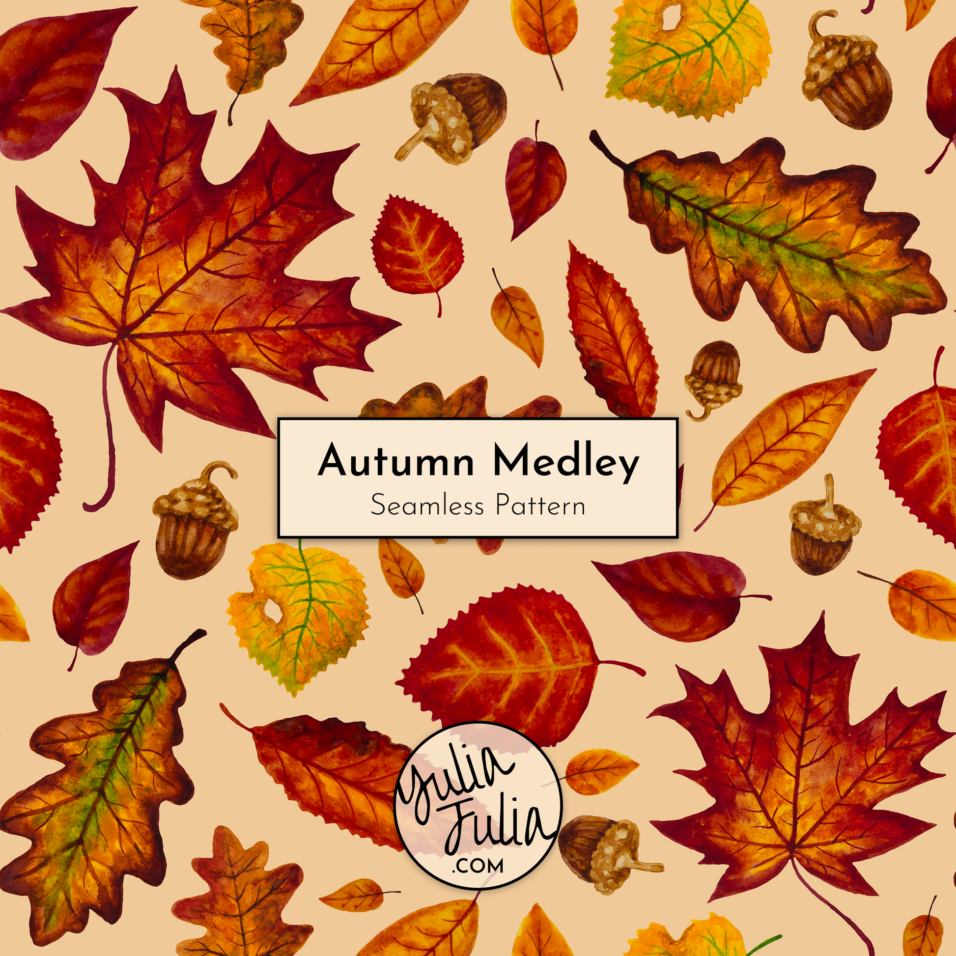 A seamless repeating pattern featuring autumn leaves and acorns in warm earth tones and bold shades of reds and oranges. The elements in this patterns were painted by hand using fine artists watercolors and professionally digitized for print.